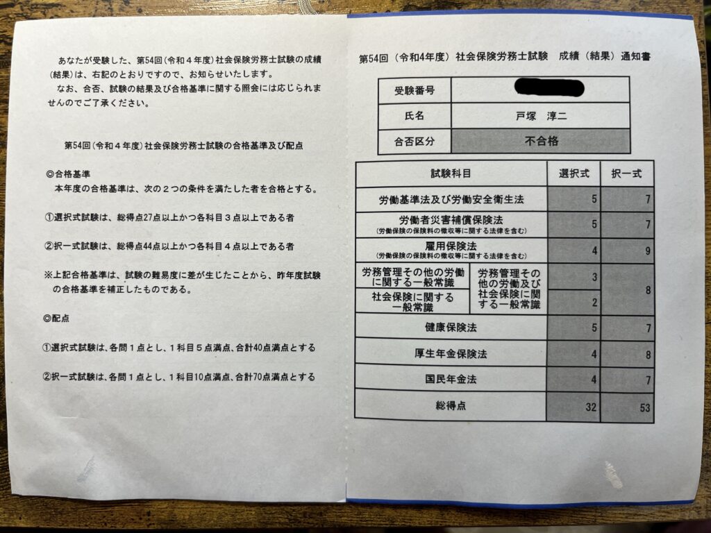 令和4年度社労士試験を終えた受験生のリアルな自己採点記録。選択式「社一」で2点を取り不合格確定かと思いきや、択一式は53点で合格圏内。救済措置への期待と試験当日の葛藤を綴ります。